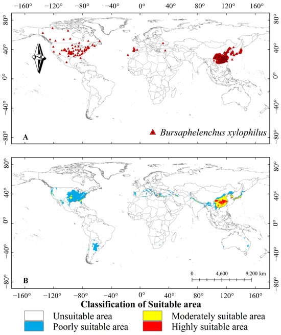 The global distribution and predicted distribution of pine wood nematode (PWN). (A) Global geographic distribution of the occurrence points of PWN; (B) Predicted distribution of PWN suitable areas under current climatic conditions. Note: In the horizontal direction, the negative value is the west longitude, and the positive value is the east longitude; In the vertical direction, negative values are south latitudes and positive values are north latitudes. Adapted from Xiao et al. (2023) [].