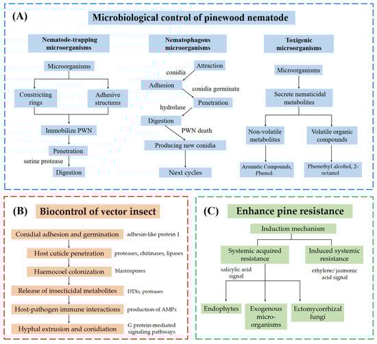 To understand the molecular interactions between PWD and biological control microorganisms, we comprehensively reviewed the molecular mechanisms of microbial control of PWN through three fundamental aspects. First, we examined how microorganisms control the PWN population through two primary pathways: physical attack mechanisms and the production of nematicidal substances, with particular emphasis on volatile organic compounds (VOCs). Second, we summarized the interactions between microorganisms and PWN vectors, exploring how microbial agents can effectively control these vectors to prevent PWN transmission. Third, we evaluated how beneficial microorganisms can enhance pine tree resistance to PWN infection. We discussed these mechanisms in detail, with special attention to the molecular and biochemical pathways through which microorganisms induce enhanced plant resistance. Our work provides a new vision for developing an integrated biological control strategy against PWD.