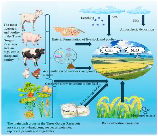 The International Climate Change Commission (IPCC) has established standardized guidelines for GHG inventory compilation. This study derives emission factors from IPCC parameters and the literature specific to the southwestern region, with estimation methodologies grounded in nitrogen input data from the Three Gorges Reservoir. Given the region’s low carbon dioxide emissions, the analysis focuses on methane (CH4) and nitrous oxide (N2O) from agricultural sources. Three primary CH4 sources are identified: rice cultivation, enteric fermentation in livestock, and livestock manure management. N2O emissions originate from five agricultural activities: synthetic fertilizer application, livestock manure management, crop residue return, atmospheric leaching, and atmospheric deposition. Key accounting categories are illustrated in Figure 2.