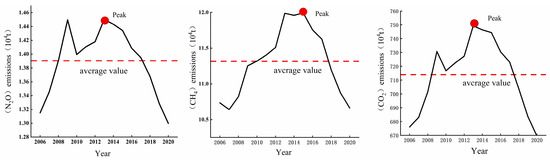 CH4 emissions from agricultural sources in the Three Gorges Reservoir ranged from 106,400 to 119,900 tons (Figure 3). The multi-year average was 113,100 tons, peaking at 119,900 tons in 2015. The multi-year average stood at 116,300 tons, peaking at 127,800 tons in 2018 with an overall pattern of gradual growth followed by decline. Concurrently, agricultural N2O emissions displayed a narrower range of 13,000 to 14,400 tons during the same period, maintaining a multi-year average of 13,900 tons. The peak emission level reached 14,500 tons in 2013, followed by a sustained downward trajectory. Using 100-year GWP metrics, CO2-equivalent emissions in the reservoir spanned 6.76–7.49 Mt (avg.7.22 Mt/yr), exhibiting initial growth then decline. This quantification reveals agriculture-climate dynamics in this ecologically critical zone.