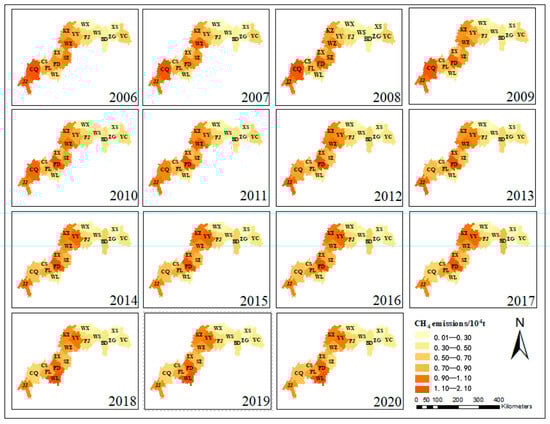 Spatial distribution of CH4 from 2006 to 2020.