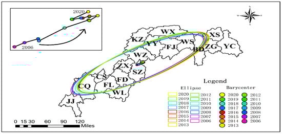 The Three Gorges Reservoir exhibits pronounced spatially heterogeneous patterns in agricultural GHG emissions. Methane (CH4) emission hotspots (Figure 4) demonstrate significant spatial autocorrelation (annual Moran’s I = 0.42, p < 0.01), predominantly clustered in the reservoir’s head and central zones. Municipal-level differential analysis (p < 0.01) reveals marked emission reductions in urban cores (Chongqing metropolitan area, Yichang city) and Shizhu County over 15 years, contrasting with a persistent growth trajectory observed in seven riparian agricultural counties (Fuling-Wuxi corridor). Spatiotemporal evolution analysis (Figure 5) identifies a tri-phase migration of CH4 emission centroids: northeastward orientation, westward shift (2013 inflection point), and subsequent southwestward drift (2018 pivotal transition). This spatial polarization phenomenon elucidates the dynamic interplay between agricultural intensification and ecological conservation processes. The quantified migration pathways provide geospatial evidence for developing basin-scale zoned governance strategies, effectively bridging agroecological management with climate mitigation objectives.