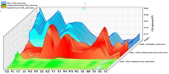 Agricultural CH4 emissions in the Three Gorges Reservoir demonstrate distinct sectoral patterns (Figure 8). Rice cultivation remained the dominant source (52,900 tons, 49.66%), followed by livestock enteric fermentation (45,000 tons, 42.16%) and manure management (8700 tons, 8.17%). Sectoral trends revealed the following: rice-related emissions decreased progressively, livestock fermentation emissions peaked then declined, and manure emissions maintained low yet steadily decreasing proportions since 2013.