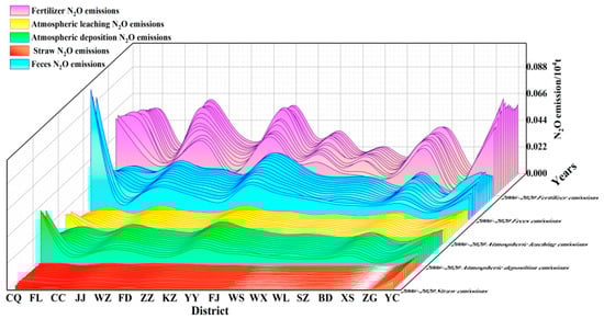 Agricultural N2O emissions in the Three Gorges Reservoir demonstrate stable sectoral proportions over 15 years (Figure 9). Synthetic fertilizers constitute the dominant contributor (5900 tons, 45.08%), followed by livestock manure management (3200 tons, 24.36%). Other sources include atmospheric deposition (15.21%), and field residues (12.50%) showed minimal variation. Sectoral trends reveal the following: fertilizer-derived emissions peaked then declined, while livestock/poultry and crop residue emissions decreased progressively. Atmospheric nitrogen deposition maintained stable fluxes without distinct temporal patterns.