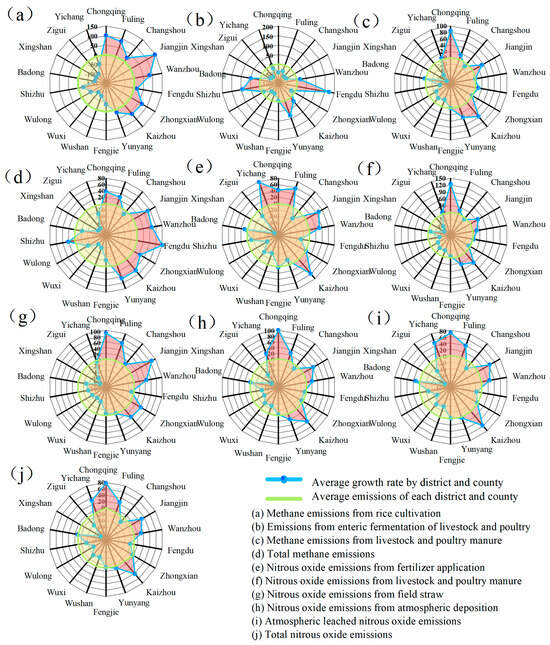 This study identifies critical emission hotspots in the Three Gorges Reservoir through comparative analysis of municipal versus regional emission growth rates (Figure 10). For agricultural methane (CH4), Chongqing’s urban core and Jiangjin District demonstrate severe methane overshoot in rice cultivation (growth exceeding 100%), necessitating prioritized paddy water management. Concurrently, districts with over 80% growth in livestock enteric fermentation emissions require feed optimization interventions. Manure management hotspots in Chongqing’s urban core and Kaizhou District (>50% growth) urgently require infrastructure upgrades, while Jiangjin, Wanzhou, Fengdu, Kaizhou, and Yunyang emerge as cross-sectoral CH4 priority zones.