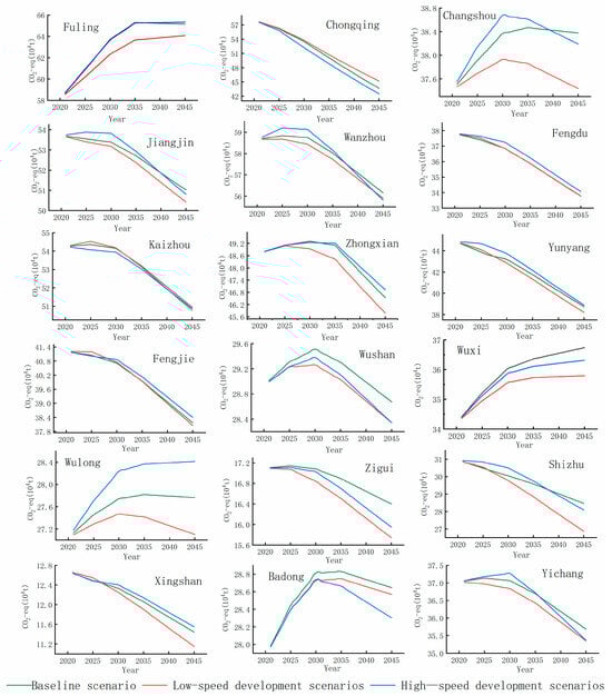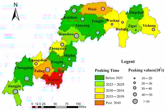 Under low-, baseline-, and rapid-development scenarios, 12, 11, and 10 districts/counties, respectively, are projected to achieve carbon peaking before 2030. Five regions—Chongqing’s central urban area, Fuling, Jiangjin, Wanzhou, and Kaizhou—consistently exhibit peaking volumes exceeding 500,000 tons CO2-eq across all scenarios, necessitating prioritized monitoring. Regions should implement tailored pathways through policy interventions, low-carbon innovation, and public engagement based on regional development contexts to accelerate peaking targets.