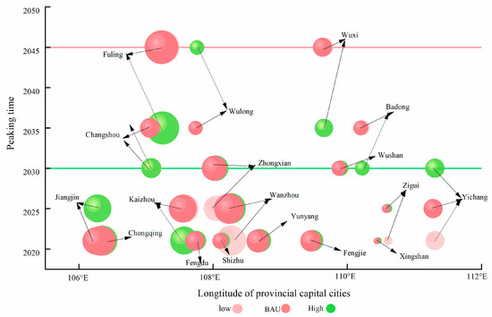 China’s carbon neutrality commitment necessitates subnational implementation frameworks that transcend singular peaking timelines, particularly within the Three Gorges Reservoir’s 18 districts (2021–2045). This study establishes a spatiotemporal visualization paradigm where geospatial bubbles encode cumulative emission magnitudes through proportional sizing, chronological positioning (2030 green baseline vs. 2045+ red threshold), and scenario differentiation via chromatic coding (green: low-speed; pink: baseline; and red: rapid development). Twelve districts demonstrate pre-2030 peaking capacity across scenarios, mandating pathway optimization through comparative emission integrals—exemplified by Chongqing’s urban core where baseline conditions minimize long-term emission loads, contrasted with Yichang’s temporally divergent patterns (2025 baseline vs. pre-2021 low-speed vs. 2030 rapid development peaks). This framework treats peaking milestones as dynamic variables in multi-scale decarbonization, emphasizing context-specific optimization based on district-level development trajectories. (Figure 16; Table 6).