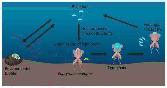 - Fung, B.L.; Esin, J.J.; Visick, K.L. Vibrio fischeri: A model for host-associated biofilm formation. J. Bacteriol. 2024, 206, e00370-23. [Google Scholar] [CrossRef]
