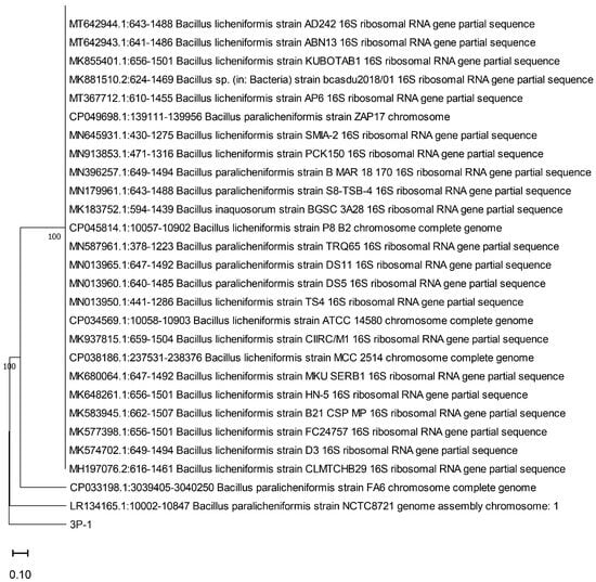 Molecular identification using 16S rRNA gene sequence analysis provided information on strains with high genetic similarity to other strains. The 3P-1 strain displayed 98.9% similarity to Bacillus licheniformis strain IND 706, which is a Gram-positive bacterium commonly found in soil. This analysis involved 30 nucleotide sequences. All ambiguous positions were removed for each sequence pair (pairwise deletion option). There were 956 positions in the final dataset. Evolutionary analyses were conducted in MEGA11 [11]. The neighbor-joining method was used to construct four phylogenetic trees by comparing the sequences of the novel strains with those from the NCBI database.