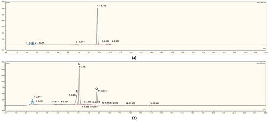 Comparison of high-performance liquid chromatography (HPLC) chromatograms (a) before and (b) after quercetin bioconversion. Peaks were detected at 360 nm. The retention times (RTs) of major compounds are as follows: rutin (R), RT = 6.807 min; unknown compound (U), RT = 7.067 min; quercetin (Q), RT = 8.773 min.