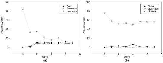 Changes in flavonoid composition in tryptic soy broth (TSB) medium containing 200 ppm quercetin over 7 days: (a) fermented with strain 3P-1; (b) unfermented control without strain 3P-1. Rutin, quercetin, and an unknown compound were quantified based on peak area (mAU·min).