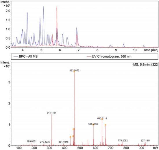 The spectrum analysis revealed that the peak at 5.6 min corresponded to molecular weights of 437.2754, 455.2130, 463.0872, and 586.2866 g/mol. The peak at 5.8 min corresponded to molecular weights of 463.0872 and 563.1039 g/mol. The chemical ion formulae were determined based on the molecular weights, as listed in Table 1. Compounds corresponding to these formulae were identified using a PubChem search.