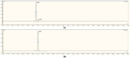 High-performance liquid chromatography (HPLC) chromatograms of flavonoid standards used for peak identification. (a) Rutin at 100 ppm with a retention time of 6.813 min and peak area of 39.1909 mAU·min; (b) isoquercetin (quercetin-3-O-glucoside) with a retention time of 7.033 min and peak area of 48.4411 mAU·min.