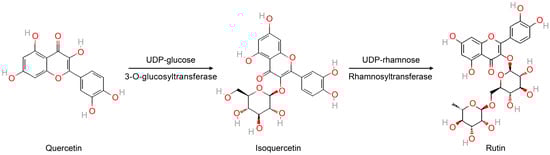 Proposed bioconversion pathway of quercetin to its glycosylated derivatives via enzymatic transformation. Quercetin undergoes glycosylation at the 3-hydroxyl position by glycosyltransferase, forming isoquercetin (quercetin-3-O-glucoside). Subsequent rhamnosylation by rhamnosyltransferase or related enzymes leads to the formation of rutin (quercetin-3-O-rutinoside). These glycosylated products exhibit improved solubility, stability, and bioavailability compared to the aglycone form. Chemical structures: quercetin (CID: 5280343), isoquercetin (CID: 5280804), and rutin (CID: 5280805). Structures were retrieved from the PubChem database (https://pubchem.ncbi.nlm.nih.gov, accessed on 12 April 2025).