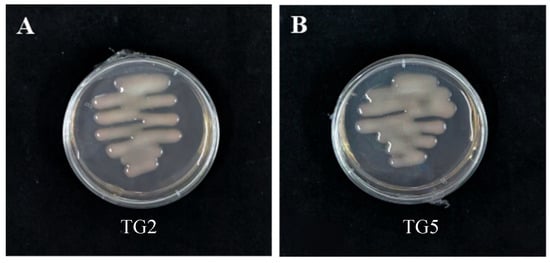 The test strain was inoculated onto agar plates and incubated at 28 °C. After 3 days of growth, 1 mL of 3% hydrogen peroxide (H2O2) solution was added directly to the bacterial colonies. The reaction was observed for 5 min. A positive result was identified by the rapid formation of gas bubbles on the surface of the colonies, indicating the presence of catalase activity. Conversely, if no visible gas bubbles were produced, the result was recorded as negative, meaning an absence of catalase in the tested strain. This experiment was conducted with three independent biological replicates to ensure reliability and reproducibility [20].
