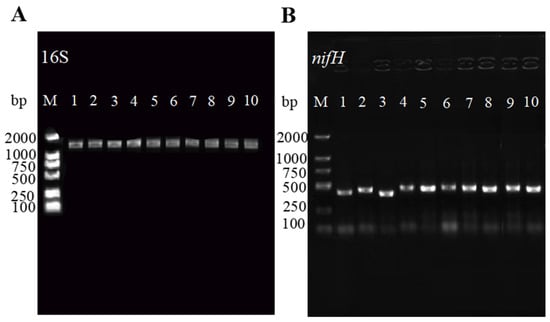 PCR amplification results of Rhizobium 16S rDNA and nitrogen fixation gene nifH: (A) 16S rDNA amplification results. (B) nifH nitrogen fixation gene amplification results. M: DL2000; 1: TG1; 2: TG2; 3: TG3; 4: TG4; 5: TG5; 6: TG6; 7: TG7; 8: TG8; 9: TG9; 10: TG10.
