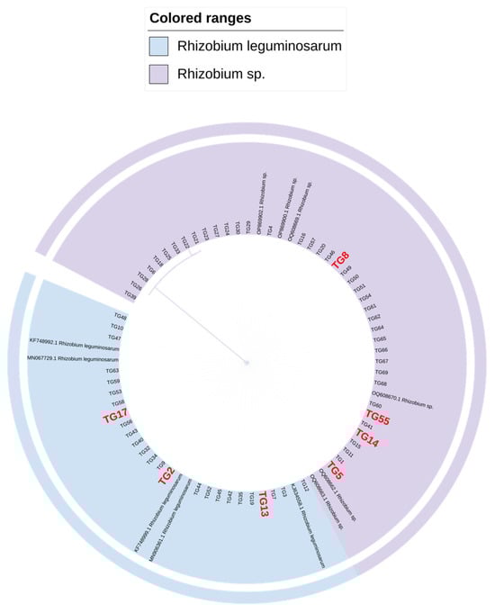 The physiological and biochemical responses of rhizobia are relevant for their classification and identification. Therefore, the physiological and biochemical responses of all strains were determined. Among all the strains listed in Table 2, only eight strains (TG 3, TG 6, TG 8, TG 10, TG 32, TG 60, TG 66, and TG 67) yielded a negative reaction with no air bubbles produced. In contrast, the remaining 57 strains produced positive reactions, with 57 strains exhibiting yellow coloration, and eight strains (TG 13, TG 16, TG 34, TG 39, TG 41, TG 44, TG 56, and TG 58) producing an alkali blue coloration. The physiological and biochemical tests revealed notable differences in the responses of the rhizobia strains, highlighting their diverse physiological and biochemical characteristics.