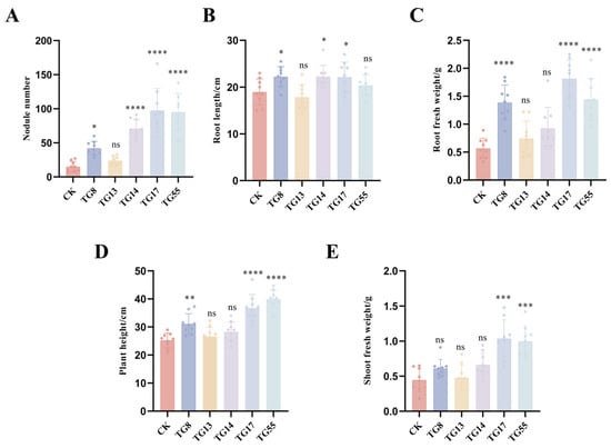 Phenotypic and growth index measurements of Rhizobium re-inoculation growth status: (A–E) are growth indexes measured after Rhizobium inoculation: (A) is the number of nodules (nos.); (B) is the root length (cm); (C) is the fresh weight of roots (g); (D) is the plant height (cm); and (E) is the fresh weight of shoots (g). Student’s t-tests were performed (ns: no significant difference. * p < 0.05, ** p < 0.01, and *** p < 0.001, **** p < 0.001, n = 6).