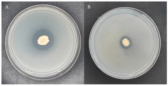 Plate phosphorus solubilization effect of the strain YS-13. (A) Illustrates the phosphate-solubilizing effect of the strain on NBRIP organic phosphorus (lecithin) and (B) inorganic phosphorus (calcium phosphate) media plates.