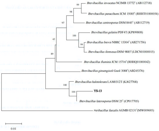 Phylogenetic tree was constructed on the basis of the 16S rDNA sequence in YS-13 and homologous sequences obtained from the NCBI database. MEGA software was used to construct the phylogenetic tree according to the neighbor-joining method, with 1000 bootstrap replicates. Only nodes with bootstrap values greater than 50% were displayed. The superscripted “T” indicates type strain.