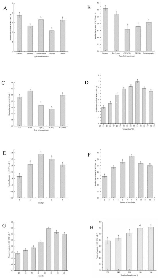 In the fermentation test, the number of live bacteria was used as the determination index. For each treatment, three repetitions were performed, and the average value was calculated. The number of live bacteria in the fermentation solution was determined by the plate counting method [29]. Single-Factor Experiments [30,31]: Using the previously screened strain as the test strain, the medium composition and fermentation conditions were optimized. The viable cell count was measured using the plate counting method. Based on the basic medium composition and fermentation conditions, the effects of various factors were studied, including carbon sources (glucose, sucrose, soluble starch, fructose, and lactose), nitrogen sources (ammonium sulfate, beef extract, peptone, and ammonium nitrate), and inorganic salts (calcium chloride, magnesium chloride, magnesium sulfate, and potassium chloride).