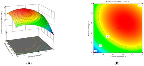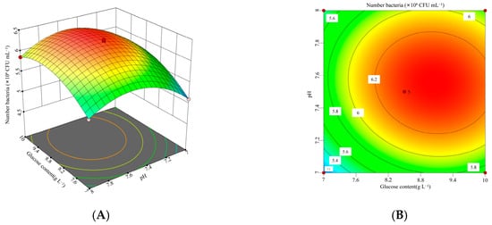 According to the response surface analysis shown in Figure 5, Figure 6 and Figure 7, the viable cell count initially increased and then decreased as the values of two interacting factors increased. This indicates that each pair of interacting factors has an optimal combination for maximizing the response. Using Design-Expert 13 software, the optimal levels of the significant factors were determined to be 8.96 g L−1 for glucose, 8.86 g L−1 for peptone, and 7.55 for initial pH. Under these optimized conditions, the model predicted the maximum viable cell count to be 6.40 × 108 CFU mL−1. To validate the model, three independent experiments were performed under these conditions, yielding an average viable cell count of 6.29 × 108 CFU mL−1, which was 98.33% of the predicted value (p < 0.05). These results demonstrate that the model accurately predicted the viable cell count.