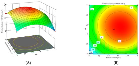 Interaction between peptone concentration and initial pH and corresponding response surface plot. (A) Interaction plot for the peptone concentrations and initial pH. (B) Three-dimensional interaction plot for the peptone concentrations and initial pH.