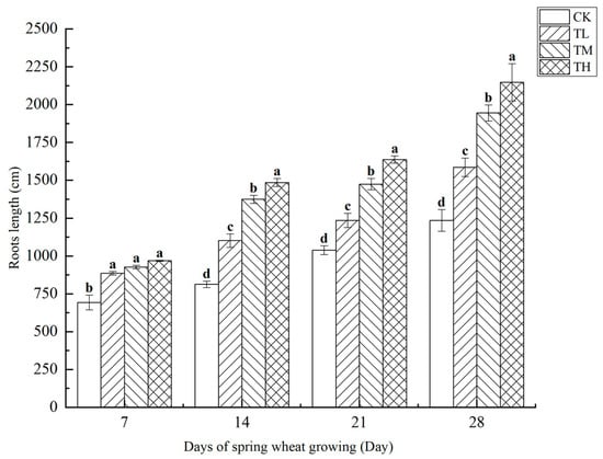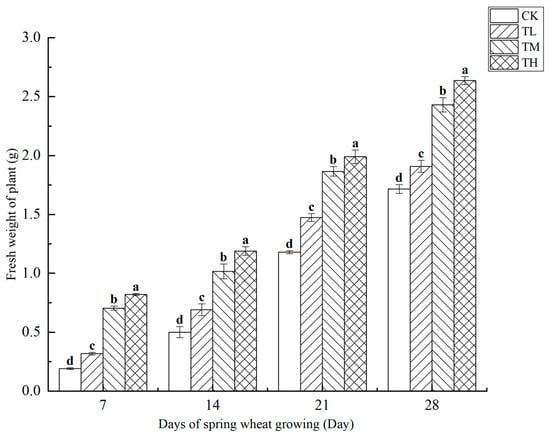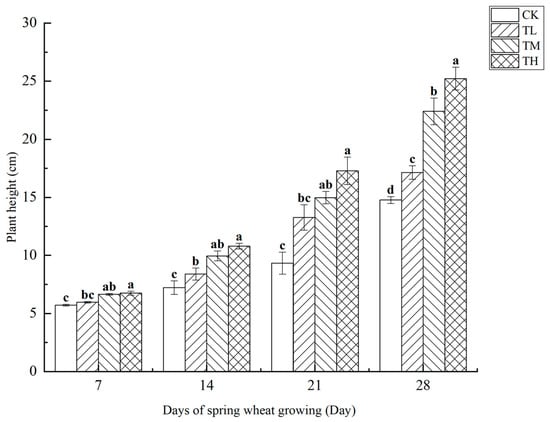 As shown in Figure 8, treatments with varying concentrations of B. laterosporus significantly enhanced wheat plant height (p < 0.05). Over the first 14 days of growth, the plant height in the TH and TM groups was notably higher than in the TL group, which also showed a significant difference compared to CK. However, plant height did not show a direct correlation with bacterial concentration. On days 21 and 28, significant differences in plant height were observed across all treatment groups (p < 0.05), with the TH group showing the greatest increase. By day 28, the plant heights in the TH, TM, and TL groups were 70.75%, 51.73%, and 29.59% higher, respectively, compared to the control (p < 0.05). The most substantial growth occurred between days 21 and 28.