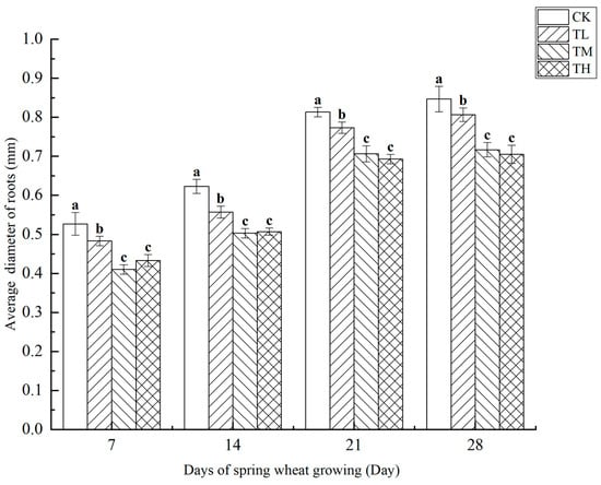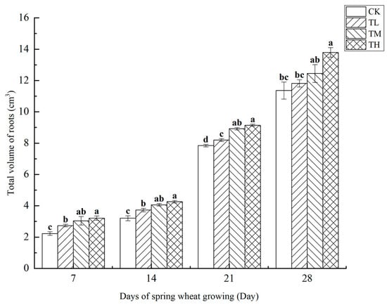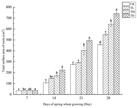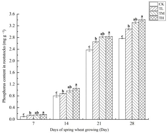 The phosphorus content in the wheat roots and shoots was determined by the wet digestion method. Weigh 0.15 g of ground, dried wheat sample, add concentrated sulfuric acid and a small amount of deionized water to moisten the sample, and heat it at a low temperature. Once white smoke appears and the mixture turns brownish-black, gradually add 30% H2O2 for oxidative digestion until the solution becomes clear or colorless, then make up the volume to 50 mL and let it sit overnight. For the phosphorus content measurement, take 2.5 mL of the supernatant, dilute it to 30 mL, add 2 drops of 2,6-dinitrophenol indicator, adjust the pH to yellow using 6 mol L−1 NaOH, and then add sulfuric acid to bleach the solution. Next, add 5 mL of molybdenum–antimony reagent, dilute to 50 mL, and allow the color to develop for 30 min. Measure the absorbance at 720 nm using a colorimeter, calibrating to zero with a blank sample, and calculate the phosphorus content based on the calibration curve [37].