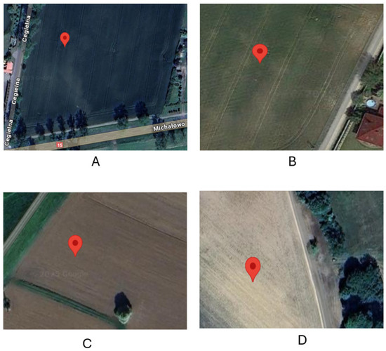 The map showing the investigated four locations at (A): Gniewkowo (G); (B): Lulkowo (L); (C): Wielka Nieszawka (N); and (D): Suchatówka (S).