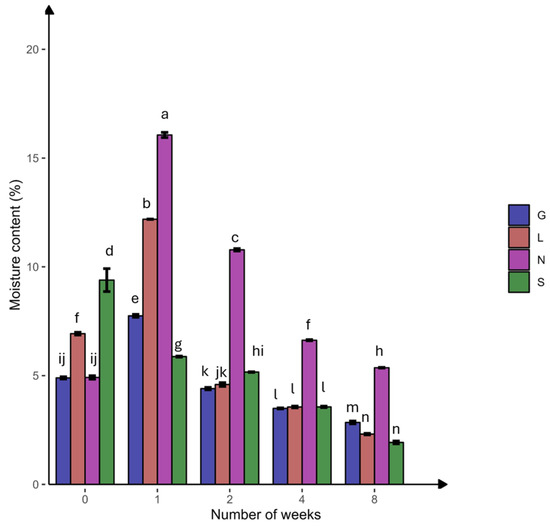 Percentage of soil moisture content at four agricultural soil samples collected from Gniewkowo (G), Lulkowo (L), Wielka Nieszawka (N), and Suchatówka (S) (p value < 0.05). All statistical analyses were carried out using two-way ANOVA and Tukey’s test at p < 0.05. Different lowercase letters indicate significant differences.