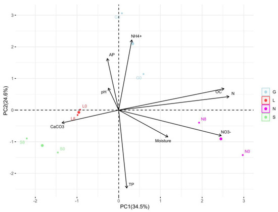 In this study, the N site had the highest clay content, but the S site had the lowest clay content compared to other sites (Table 1). The silt fraction decreased in the S site but increased in other sites at T8. The highest moisture content was at T1, followed by a significant decline toward the end of the experiment, with the highest reduction in the sandy S site (Figure 2). The carbon and nitrogen contents significantly decreased (p < 0.05) at the N site (Table 2). At T8, a significant difference (p < 0.05) was observed for P, P2O5, and NO3− at all sites. The S site was more calcareous compared to the other sites and decreased significantly (p < 0.05) at T8, while remaining constant at the other sites. The NH4+ content decreased and increased significantly (p < 0.05) at the G and S sites, respectively. The average total phosphorous content was higher compared to the available phosphorus (P2O5). The pH ranged from slightly acidic to alkaline conditions. Overall, Table S2 confirms the significant positive correlation (r = 0.179–0.994 range; except for CaCO3, at the L site, which was not applicable due to zero CaCO3 content) between the soil moisture content and physicochemical properties at T0 and T8. The pH showed a strong positive correlation with calcium carbonate (G0: 0.99, G8: 0.89) (Table S7). Phosphorus showed a strong positive correlation with available phosphorus (G8: 1.00). Nitrogen showed a strong positive correlation with nitrate (G8: 0.98, L8: 1.00, N8: 0.99) (Table S7 and Figure 3). The PCA analysis (Figure S1A) revealed that a major portion of the total variance (97.5%) of the studied variables (soil physicochemical parameters) was grouped between five components, and two of them explained 59.1% (Figure S1B). The variables that contributed most to Dim1 of the PCA axes were OC (0.93), N (0.97), TP (0.07), and NO3− (0.91), whereas NH4+ (0.82) and AP (0.60) contributed most to Dim2 (Figure S1A). The results presented in Figure 3 reveal a clear and statistically significant positive significance between sites (G, L, N, S at T0 and T8) and the soil physicochemical parameters with respect to the soil moisture content. More specifically, the G soil site was scattered in the upper right–centered quadrant of the PCA plot, indicating a strong association with OC, N, AP, pH, and NH4+ (Figure 3). On the contrary, the L and S sites were scattered in the lower left–centered quadrant, showing an association with AP, pH, and CaCO3 (Figure 3). A corresponding association was observed for the N site, which was scattered in the lower right quadrant with NO3−, TP, OC and N variables, respectively (Figure 3).