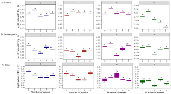 Changes in number of microbial populations under varying soil moisture conditions across four agricultural soil samples. All analyses were performed in triplicate, and the data are presented as mean ± SD. All statistical analyses were carried out using a one-way ANOVA and Tukey’s test at p < 0.05. G: Gniewkowo, L: Lulkowo, N: Wielka Nieszawa, S: Suchatówka, 0: week 0, 8: week 8. Different lowercase letters indicate significant differences.