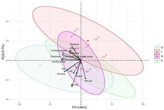 Principal component analysis (PCA) indicating correlations between soil moisture content and biological parameters across four soil samples at T0 and T8 time intervals. The distribution of each site is scattered among the first two components of the PCA (95% confidence ellipses) and respective grouping. G: Gniewkowo, L: Lulkowo, N: Wielka Nieszawa, S: Suchatówka, 0: week 0, 8: week 8, Actino: Actinomycetes, PH-AC: Acid phosphatase, PH-AL: alkaline phosphatase, DH: dehydrogenase, UR: urease, 0: week 0, 1: week 1, 2: week 2, 4: week 4, 8: week 8.