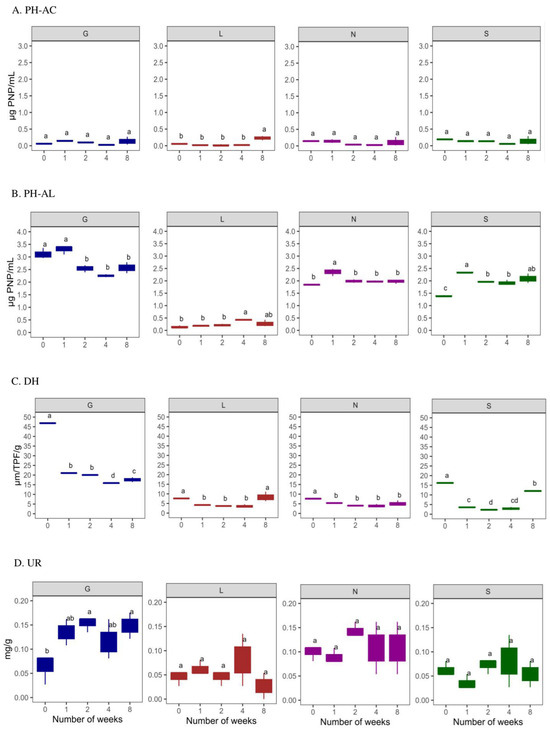 Enzyme activities at four types of agricultural soil samples. (A) Acid phosphatase (ACP); (B) alkaline phosphatase (ALP); (C) dehydrogenase (DH) (D) urease (UR) enzyme activities. All analyses were performed in triplicate, and the data are presented as mean ± SD. All statistical analyses were carried out using one-way ANOVA and Tukey’s test p < 0.05. G: Gniewkowo, L: Lulkowo, N: Wielka Nieszawa, S: Suchatówka. Different lowercase letters indicate significant differences.