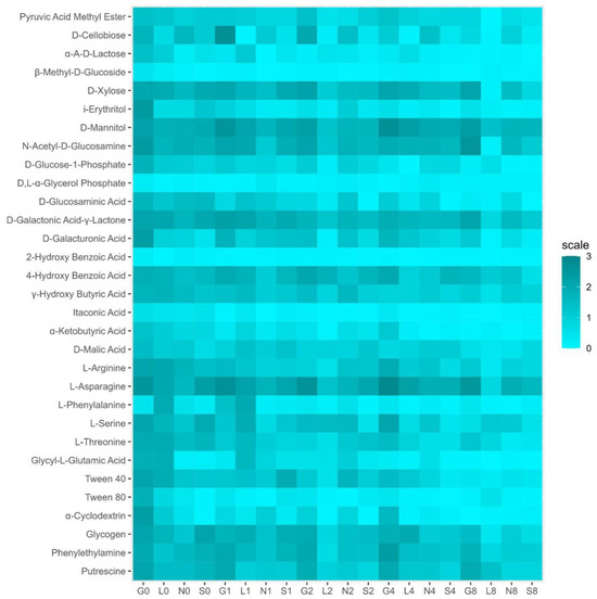 Heat map for community level physiological profiles (CLPPs) in four types of agricultural soil samples. G, Gniewkowo; L, Lulkowo; N, Wielka Nieszawa; S, Suchatówka.