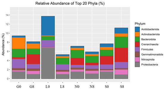 Relative abundance of bacterial phyla identified by 16S rRNA amplicon sequencing. G: Gniewkowo, L: Lulkowo, N: Wielka Nieszawka, S: Suchatówka, 0: collection date, 8: 8 weeks of drought.
