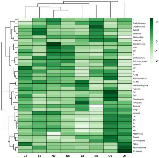 Soil cluster heatmap with most relevant variables between the biological, physicochemical, and amplicon sequence datasets to examine the joint effects. G: Gniewkowo, L: Lulkowo, N: Wielka Nieszawka, S: Suchatówka, 0: sampling day, 8: 8 weeks of drought; PH-AC: acid phosphatase, PH-AL: alkaline phosphatase, DH: dehydrogenase, UR: urease, OC: organic carbon, CaCO3: calcium carbonate, N: total nitrogen, NO3−: nitrate, NH4+: ammonium, P: total phosphorus, P2O5: available phosphorus, CA: carboxylic and acetic acids, CH: carbohydrates, PL: polymers, AA: amino acids, AM: amines, and PL: polymers.