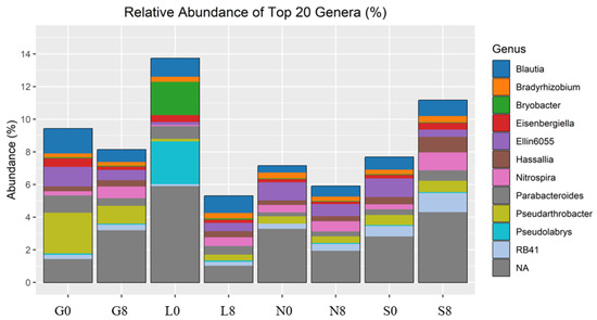 Relative abundance of bacterial genera identified by 16S rRNA amplicon sequencing. G: Gniewkowo, L: Lulkowo, N: Wielka Nieszawka, S: Suchatówka, 0: sampling day, 8: 8 weeks of drought.