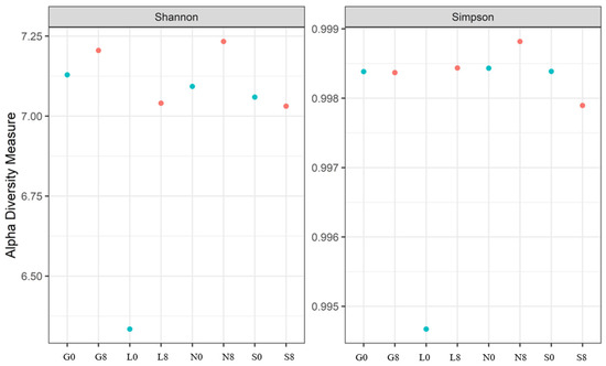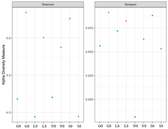 Bacterial alpha diversity indices: Shannon and Simpson indices. G: Gniewkowo, L: Lulkowo, N: Wielka Nieszawka, S: Suchatówka, 0: sampling day, 8: 8 weeks of drought.