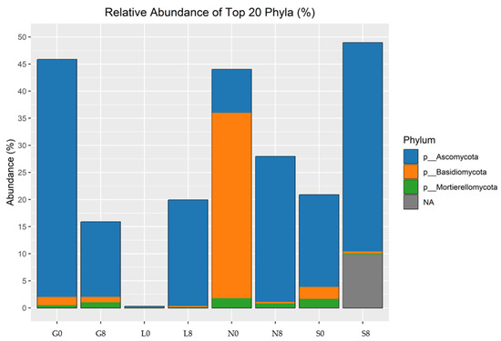 Relative abundance of fungal phyla identified by ITS amplicon sequencing. G: Gniewkowo, L: Lulkowo, N: Wielka Nieszawka, S: Suchatówka, 0: sampling day, 8: 8 weeks of drought.