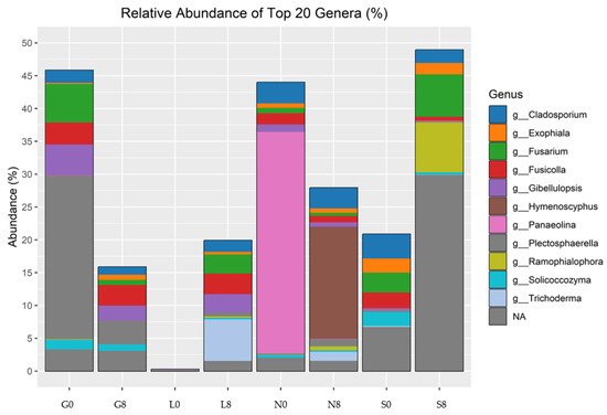 Relative abundance of fungal genera identified by ITS amplicon sequencing. G: Gniewkowo, L: Lulkowo, N: Wielka Nieszawka, S: Suchatówka, 0: sampling day, 8: 8 weeks of drought.