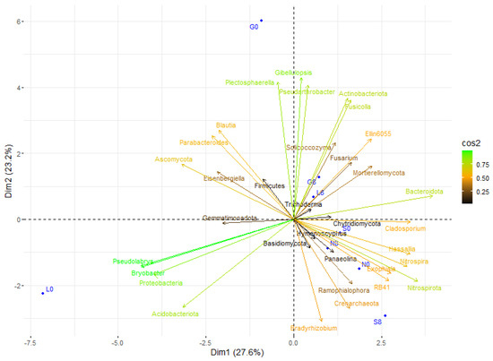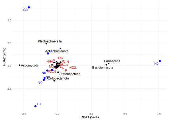 The RDA plot shows how soil physicochemical variables influence microbial community composition (Figure 16). Among the sites investigated, most at T8 showed a strong positive correlation with OC, NH4+, N, Plectosphaerella, Actinobacteriota (G), and with P, P2O5, NO3−, Ascomycota, Proteobacteria, and Acidobacteriota at the L, N, and S sites (Figure 9 and Figure 16). At T0, the G, L, and N sites were mainly weakly associated with microbial taxa Plectosphaerella, Panaelina, and Acidobacteriota, respectively, and with soil physicochemical parameters.