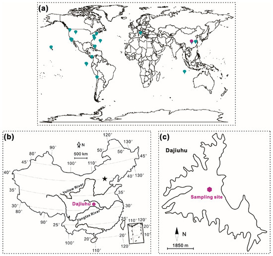 The distribution of the study sites: (a) the study sites of the available sequence data, displayed on a world map with collecting data of dark moderate cyan and sequencing data of medium dark magenta; (b) the location of the Dajiuhu Peatland and the star standing for Beijing; (c) the peat sampling site.