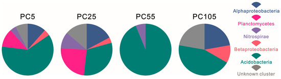 Regarding the compositions of the hopanoid-producing microbe communities in Figure 2, Acidobacteria was the dominant phylum in all four samples PC5, PC25, PC55, and PC105, with relative abundances of 61.54%, 31.03%, 93.75%, and 44.44%, respectively. Besides this, Alphaproteobacteria, Betaproteobacteria, and an unknown cluster were found only in PC5, PC25, and PC105, with the highest abundance in PC105 at percentages of 22.22%, 11.11%, and 22.22%, respectively. Planctomycetes and Nitrospirae were not found in the PC55 and PC105 samples, but higher abundance (24.14% and 10.34%) was observed in the PC25 sample.
