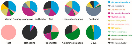 On the other hand, microbes from Alphaproteobacteria, Betaproteobacteria, and Gammaproteobacteria were the most widely distributed and survived in 8 of the 10 ecosystems. Deltaproteobacteria, the unknown cluster, Cyanobacteria, and Acidobacteria were distributed in six kinds of different ecosystems. The least prevalent groups, Verrucomicrobia and Ascomycota, survived in only 1 of the 10 ecosystems.