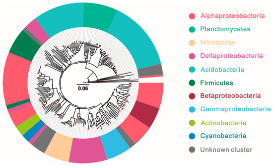 The updated reference sequences of the sqhC gene from the NCBI database were pooled with our sequences for an alignment analysis. All sqhC sequences were firstly translated into partial protein sequences using MEGA 6.0 and then aligned by using the ClustalW algorithm within conserved motifs of amino acid sequences among the SHCs from all nearby hopanoid phyla [26,27,28]. A phylogenetic tree was constructed via bootstrapping with 1000 iterations using the neighbor-joining p-distance method. The original sqhC sequencing reads from this research are included in the Supplementary Materials, Table S6.