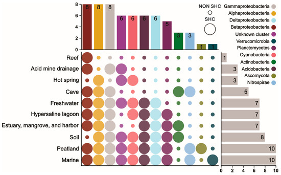 In detail, a total of 12 groups were distributed in 10 different ecosystems. Among all the different ecosystems (Figure 5), peatland and marine were the richest in microbial species (10), while the reef ecosystem had only Betaproteobacteria. Other environmental conditions, such as acid mine drainage and hot spring, were associated with three hopanoid producer groups. Besides these, cave; hypersaline lagoon; estuary, mangrove, and harbor; freshwater; and soil environments contained five, seven, seven, seven, and eight hopanoid groups, respectively.