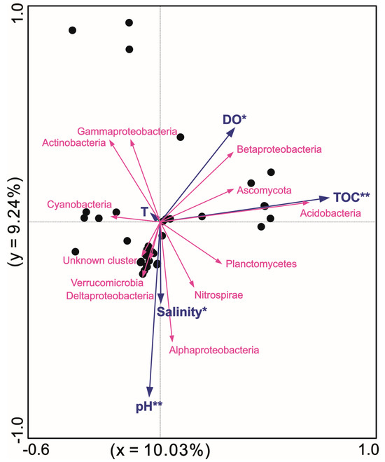 An RDA was conducted to analyze the effect of environmental factors on hopanoid producers (Figure 6). Generally, the clones and metagenomic data from the literature, along with our sequences, fell into 12 phyla adaptive to these multiple environmental parameters. Acidobacteria was positively correlated with the TOC content; however, Cyanobacteria should be negatively correlated with the TOC content. In detail, the factors pH (p = 0.002, F = 3.1) and TOC (p = 0.006, F = 3.0) highly significantly influenced the hopanoid producer microbes, while salinity (p = 0.02, F = 2.5) and DO (p = 0.034, F = 2.4) significantly shaped the hopanoid producers. Overall, the TOC, pH, salinity, DO, and T explained 8.8%, 8.4%, 6.6%, 6.1%, and 1.8% of the whole hopanoid producer groups, respectively. In total, 19.28% of the variance in the hopanoid producers and environmental parameters was explained by two axes.