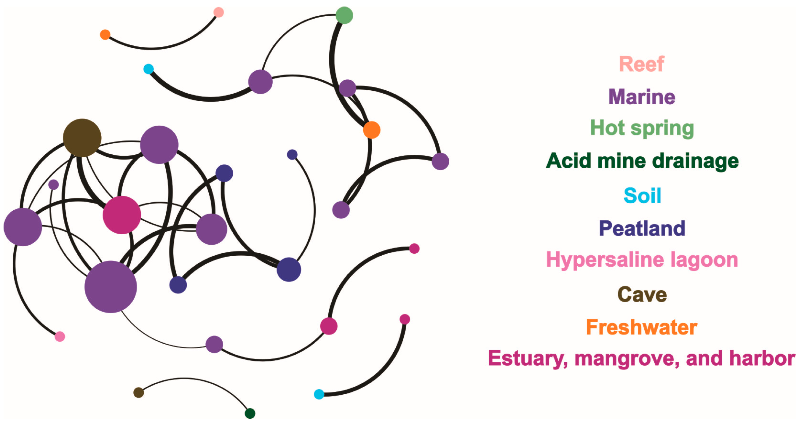 The total network based on modularity fell into 10 modules in Figure 7. Besides the greatest—the marine module—the peatland; cave; freshwater; and estuary, mangrove, and harbor modules occupied greater parts of the network. According to its relative values, the marine module was related to almost all of the modules, excluding peatland, acid mine drainage, and reef. The cave system module was closer to the modules for marine; acid mine drainage; and estuary, mangrove, and harbor. The peatland module indicated an independent ecosystem and had no relationship with the other nine modules. The freshwater module was closer to the reef, hot spring, and marine modules, while the estuary, mangrove, and harbor module shared occurrence relationships with the cave, marine, and soil ecosystems. The reef and acid mine drainage modules were each related with only one module: freshwater and cave, respectively. The hot spring module was closer to the two modules for marine and freshwater. The soil module was also closer to two modules: marine and estuary, mangrove, and harbor. The hypersaline lagoon presented a relationship in the occurrence network with only the marine ecosystem. In all, the relationship values between different nodes among the different ecosystem modules showed average r and p values of 0.91 and 0.00016, respectively.